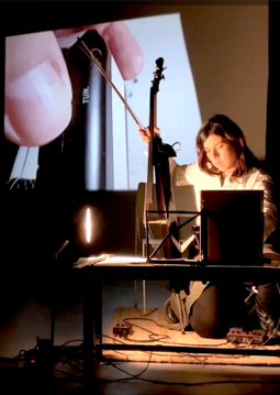 Transducción es una performance que explora la memoria emocional y muscular inscrita en la práctica del violonchelo, expandiéndola hacia otros lenguajes: la imagen, el trazo, la voz, el cuerpo y el sonido electrónico.